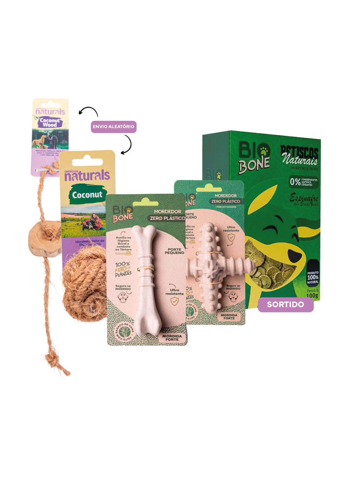 Este pack foi pensado para cães que precisam gastar energia, estimular a mente e manter uma mordida saudável, tudo com materiais naturais e zero plástico.