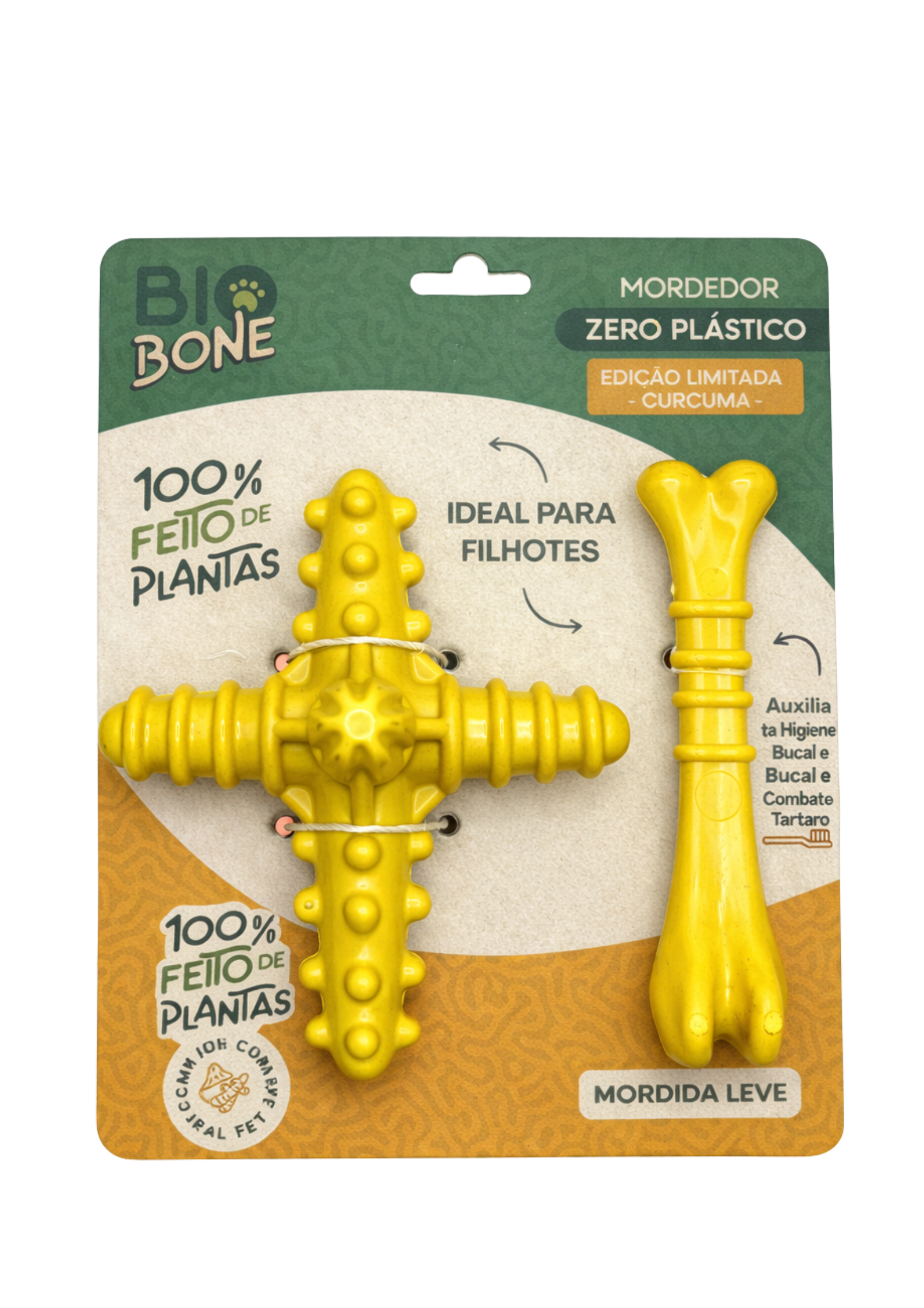 Feito com biocomposto vegetal e cúrcuma natural, ele é livre de plástico, nylon e toxinas, garantindo uma mastigação saudável desde os primeiros meses de vida.